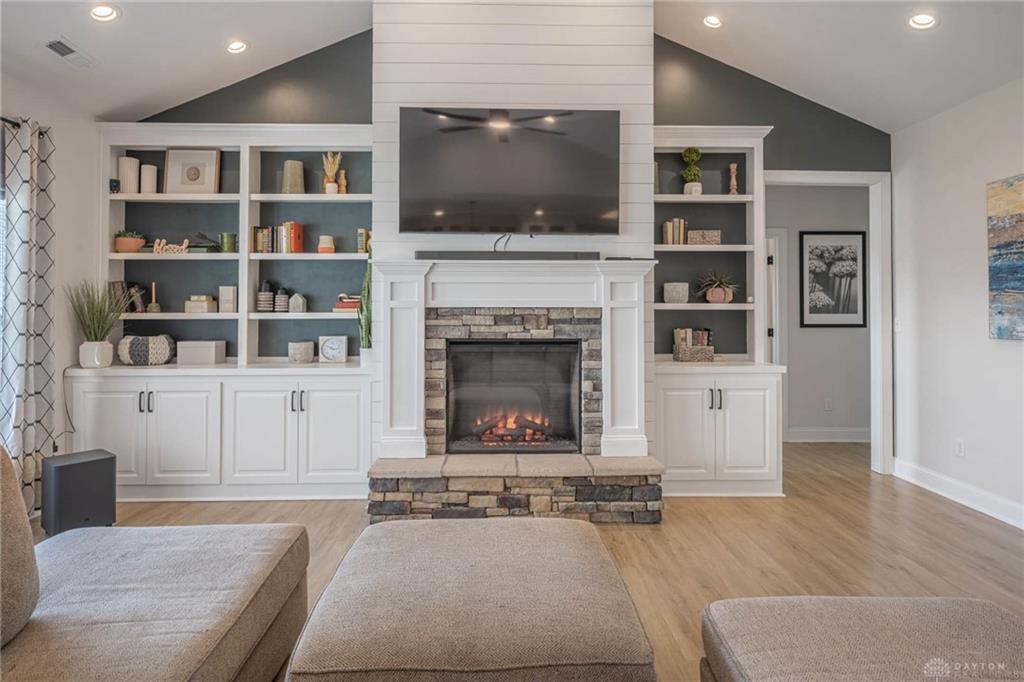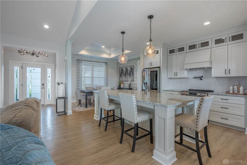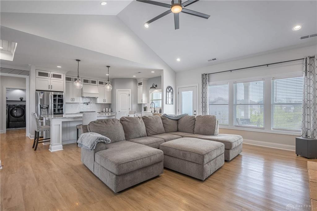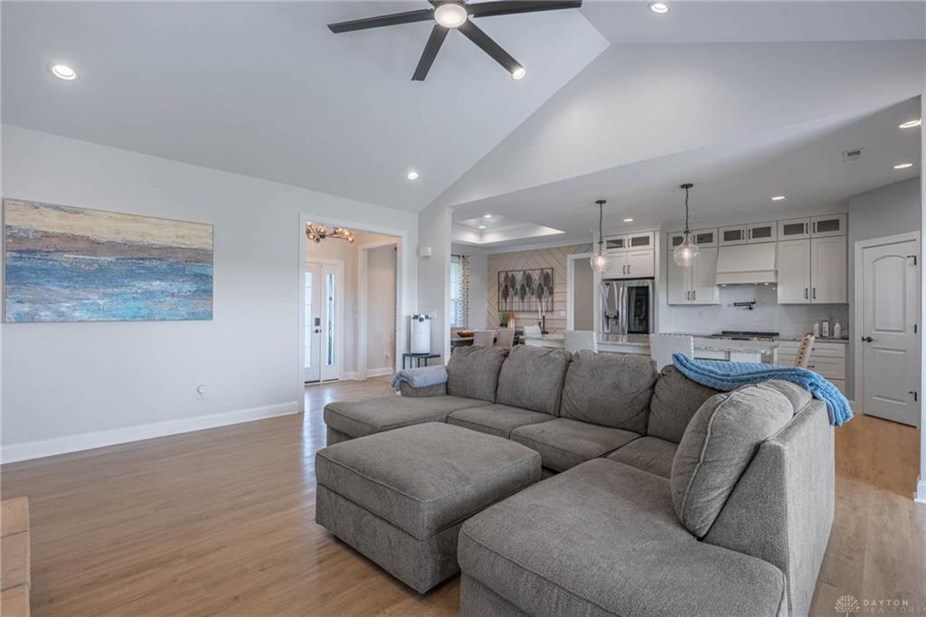 This 2022 Brandon Custom Homes ranch was originally featured as a former model and a Homerama Showcase property. The interior layout spans 2,035 square feet and features three bedrooms plus a dedicated home office that provides flexibility for a fourth bedroom. The central gathering space is defined by a dramatic cathedral ceiling and an open-concept design that connects the kitchen, dining, and living areas. The kitchen is equipped with granite countertops, upgraded custom cabinetry, and a large showcase center island. High-end finishes and fixtures are present throughout the home, maintaining a like-new condition. The split floor plan ensures privacy for the primary suite, which includes a dual vanity, a walk-in shower, and a dedicated spa soaking tub. The secondary hall bathroom also features a dual vanity and a shower-tub combination. Flooring materials include durable luxury vinyl plank in high-traffic areas and carpet in the bedrooms. As a recent 2022 construction, the mechanical systems, roof, and windows are all in excellent condition. The exterior design features a distinct front elevation that stands out within the neighborhood. Outdoor spaces include both a covered front patio and a covered rear patio, providing shaded areas for seating. The home sits on a 0.28-acre lot. The property is situated in Carlisle with convenient access to local amenities, including the nearby shops and restaurants of Carlisle, Springboro, and the Austin Landing development. For transportation and commuting, the home is positioned for easy access to major regional freeways including Interstate 75 and Interstate 675, allowing efficient travel to Dayton and Cincinnati. The combination of custom builder upgrades, a modern open layout, and a convenient location makes this property a functional and updated choice for those seeking a turn-key residence.