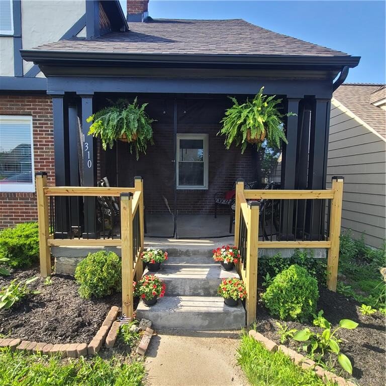 Step inside to a bright and open living area featuring gleaming hardwood floors that extend throughout, complemented by abundant natural light that creates an inviting atmosphere. The living room boasts a stylish fireplace and an elegant staircase, adding to the home's unique character. The cozy dining area, also with rich wood flooring and charming corner shelves, is ideal for intimate meals. Culinary endeavors await in the bright kitchen, equipped with sleek countertops, a modern appliance suite including a range, refrigerator, and microwave, and stylish finishes like custom counters and a geometric tile backsplash. Hardwood stairs ascend to a bright landing, blending natural warmth with contemporary design. The bedrooms offer comfort and a tranquil ambiance, with features like warm lighting, sleek wall paneling, and some including ceiling fans for added comfort. The modern bathroom showcases elegant marble tile work, modern fixtures, a stylish vanity with a sleek countertop, and a glass-enclosed shower, creating a serene and functional space. Outside, the property includes a fence, a screened-in porch for outdoor enjoyment, and a convenient storage shed. This residence truly offers a harmonious blend of style, comfort, and practicality in a desirable location.