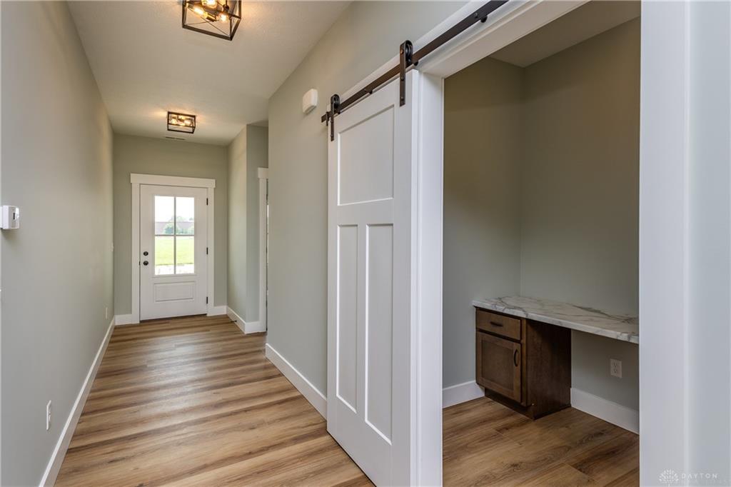 Stunning New Construction Custom Home! This beautifully designed 3-bedroom, 2-bath ranch offers 1,754 sq. ft. of open concept living with thoughtful upgrades. Enjoy 9’ ceilings with a 10’ tray in the great room, a stylish two-tone kitchen with quartz countertops, stainless steel appliances, and a walk-in pantry, plus a pocket office with a barn door—perfect for working from home or managing daily tasks. All bedrooms feature walk-in closets, and the spacious primary suite includes direct access to the laundry room through the closet for added convenience. Gorgeous lighting fixtures add warmth and character throughout the home.