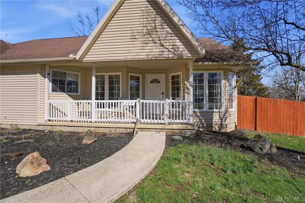 Welcome home to this beautiful ranch with a charming covered front porch. You will love the open floor plan, floor to ceiling windows and lots of natural light. The heart of the home is the great room with vaulted ceilings. The eat in kitchen has an abundance of cabinets, breakfast bar and bay window in the dining nook. The formal dining room could also be used as a den. The split floorplan allows for privacy. The primary bedroom has a nice en suite with double sinks and walk in shower, walk in closet + private access to the deck. Two additional bedrooms have access to a second full bathroom. Replacement windows, HVAC 2016. Attached 2 car garage with attic. Enjoy the deck and full fenced back yard with mature trees.