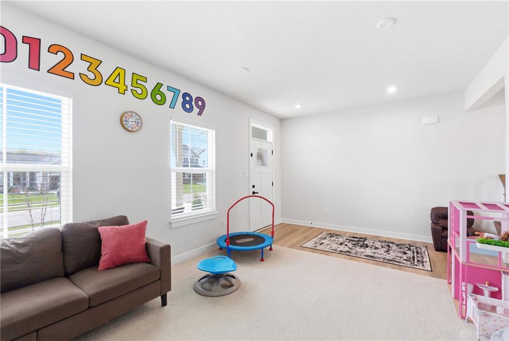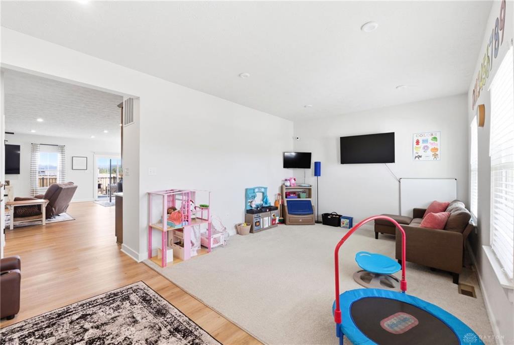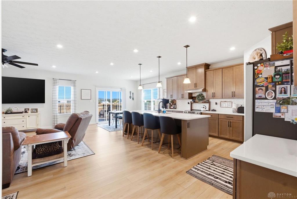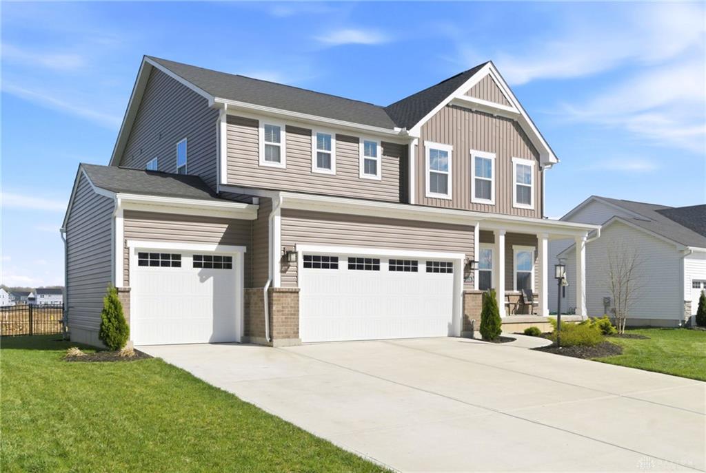 Welcome to this amazing home in an amenity-rich community within Beavercreek School District, just minutes from WPAFB. This home makes a statement with its Craftsman-inspired exterior, highlighted by stone accents, a full covered front porch, and a spacious three-car garage—delivering both curb appeal and the functionality today’s buyers are searching for. Step inside to an expansive, open-concept layout designed for both everyday living and effortless entertaining. Luxury vinyl plank flooring flows throughout the main living areas, complemented by upgraded taller baseboards and trim that add a refined touch. The heart of the home is the gourmet kitchen, featuring a large center island, quartz countertops, stainless steel appliances, soft-close cabinetry, and sleek matte black hardware-blending style and practicality seamlessly. A standout feature of this home is the main-level bedroom with a full bath, well designed in place of a traditional office. This upgrade provides exceptional flexibility, ideal for guests, or anyone seeking first-floor convenience. Upstairs, you’ll find four well sized bedrooms, a versatile loft space, and two full baths, including a hall bath with double sinks. The primary suite offers a relaxing retreat with a garden tub and separate shower. The finished basement expands your living space even further, complete with an additional bedroom, full bath, and egress—perfect for entertaining, hosting, or creating a private lower-level suite. Out back, enjoy a large deck overlooking a fully fenced yard with a black metal fence, offering both privacy and a clean, polished look! Located in the established Nathanial’s Grove community, residents enjoy two grand entrances, a pool with pool house, scenic ponds, and acres of green space connected by walking trails. With over 4,000 square feet of living space and a long list of thoughtful upgrades throughout, this home delivers the space, style, and flexibility to meet the needs of a growing household.