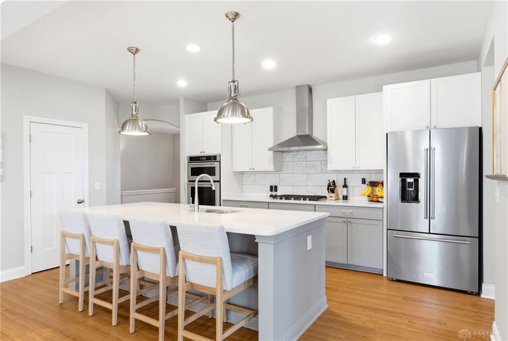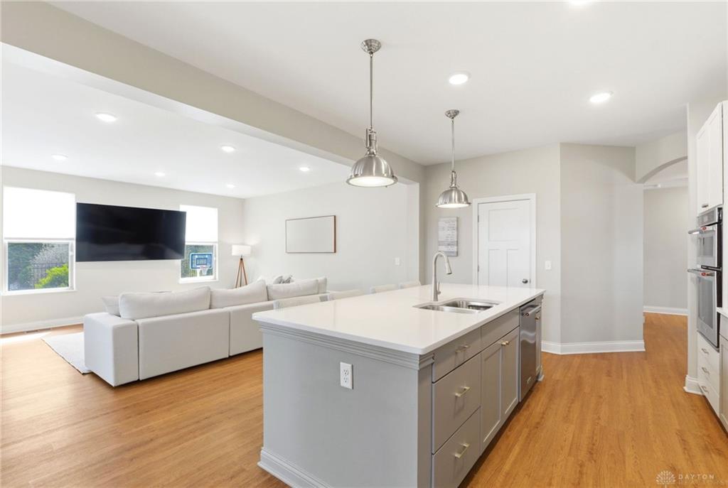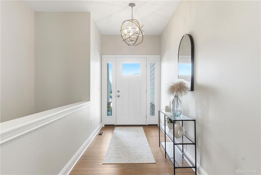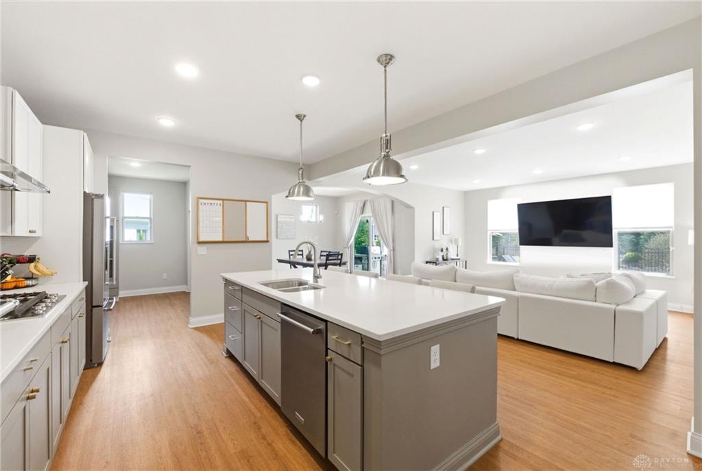 Experience sophisticated living in this remarkable 4 bedroom, 3 bathroom residence situated in Dayton, OH. Spanning 3095 square feet, this single-story home presents an exceptional fusion of contemporary amenities and tranquil surroundings. The inviting entryway, adorned with gleaming hardwood floors and an elegant light fixture, establishes a welcoming ambiance. An open-concept floor plan seamlessly integrates the bright kitchen, dining, and living areas, creating an optimal environment for both entertaining and daily routines. The kitchen, a culinary haven, is equipped with sleek appliances, an expansive island, and ample cabinetry. Stainless steel appliances, including a dishwasher, microwave, refrigerator, built-in oven, and cooktop, enhance the culinary experience. The spacious bedrooms offer comfortable living, each featuring soft carpeting, abundant natural light, and ceiling fans for enhanced comfort. The luxurious bathrooms are appointed with a double vanity, a glass-enclosed shower, and a relaxing soaking tub, providing a spa-like retreat. The versatile finished basement provides additional space for entertainment and recreation, complete with durable flooring and bright illumination. Step outside to a private oasis featuring a covered inground saltwater, heated pool, an inviting hot tub, and a spacious patio area. The expansive 0.36-acre lot ensures ample privacy and generous outdoor space. This property masterfully combines sophisticated design with functional living, creating an ideal sanctuary for discerning homeowners.