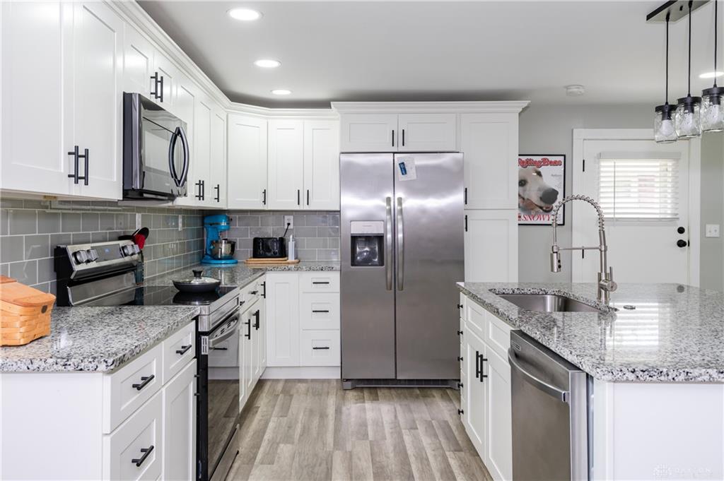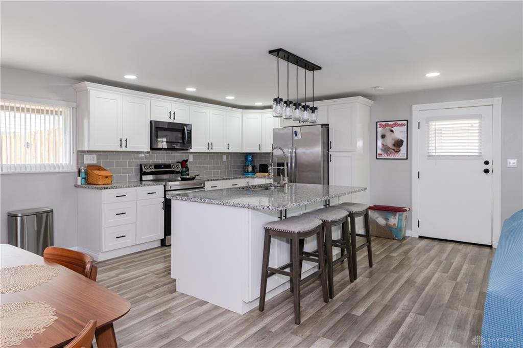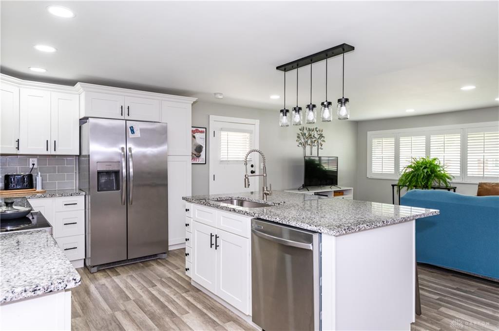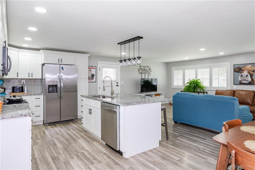 Welcome to this beautifully reimagined and thoughtfully updated home with today’s modern finishes and style. From the moment you step inside, you’ll be drawn to the one-of-a-kind open floor plan, perfect for both everyday living and entertaining. The stunning kitchen serves as the heart of the home, featuring a spacious island with sink, sleek granite countertops, updated cabinetry, and included appliances such as a refrigerator, dishwasher and microwave. Newer flooring flows seamlessly throughout, complemented by stylish updated lighting that enhances every space. This home offers 3 comfortable bedrooms and 2 full recently updated baths, providing both function and comfort. Just off the dining area, a dedicated laundry room adds convenience and charm, complete with a trendy barn door accent. Step outside to enjoy the oversized detached 2-car garage and new fully privacy fenced yard—ideal for relaxing, pets, or play. Conveniently located to shopping, restaurants, schools and I-70 for easy access to the interstate. A rare blend of character, updates, and move-in-ready appeal—this is one you won’t want to miss. Schedule your private showing today before it's too late!
