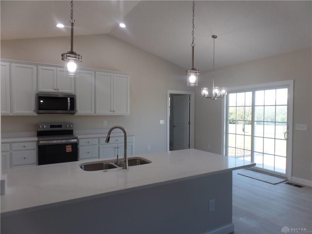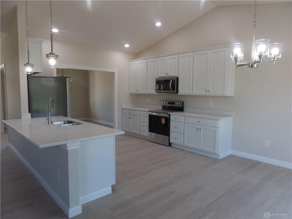 Discover the epitome of modern living in this newly constructed home, where elegant design meets functional comfort. The charming exterior, a sophisticated blend of stone, wood siding, and brick, immediately captivates. Step inside to an inviting interior featuring durable flooring and abundant natural light. The spacious, open-concept living area boasts vaulted ceilings, enhancing the sense of grandeur. The luminous kitchen is a culinary dream with crisp cabinetry, quartz countertops, a functional island, and modern stainless steel appliances including a microwave, range, dishwasher, and refrigerator. This seamless space integrates perfectly with the dining area. Three bedrooms on the main floor offer serene retreats, one featuring vaulted ceilings, ceiling fans, and spacious walk-in closets. Bathrooms are designed with contemporary tile work, elegant fixtures, a double vanity, and a pristine soaking tub. An expansive basement with a 4th bedroom, full bath and egress window along with many unfinished areas that offer a blank canvas for customization and future expansion. Outside, a spacious backyard and a three -car garage with a newly poured concrete driveway complete this exceptional property. Room for a pool and detached garage.
