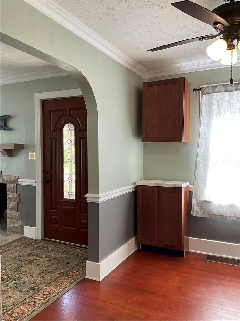 Charming 1.5 story home with numerous updates. This lovely home exudes curb appeal on a park like setting. The landscape holds fresh mulch, gorgeous trees and flowers just popping up. The paver walkway and front patio are charming. Upon entering, you'll notice the beautiful original hardwood floors flowing through the living room, dining room, hall and main level bedrooms. 6" baseboards elevate the overall look. A woodburning fireplace, crown molding, chair rail, a newer entry door plus plenty of sunlight welcome you into the living room. The dining room has built in cabinets for extra storage. An arched doorway between these two rooms adds charm to the space. The kichen is updated with warm wood tones in the Kraftmaid soft close cabinetry. The counters, tile backsplash and tile flooring create a cohesive look. The range, refrigerator and microwave are provided for you. Two main level bedrooms each with hardwood floors and cedar lined closets. The upstairs is a spacious 35x12 area housing the third bedroom which has cork floors along with carpeting and has been freshly painted. Updated windows through most of the home are approximately 5 years old. The bathroom has been thoughtfully updated with tiled shower walls and floor, jacuzi tub, vanity and adjoining cabinet, toilet and beautiful lighting. The full basement is partially finished with a rec room with tiled floor, a wet bar with maple cabinets and corian counters, the accent shelf above is Italian marble. The basement also houses the half bath, laundry and two storage areas. A breezeway connects the garage and home adding a nice sitting area or mud room opportunity. The outdoor space is wonderful with a spacious cedar pergola, a huge concrete patio area with a built in grill. The rear yard is fenced and provides garden areas. All appliances convey. Updates also include new gutters and spouting approx 2024. Roof is approx 15 years old. This is a fantastic move in ready home with so much to offer!