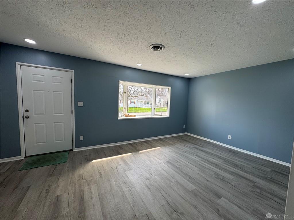 Discover the charm of single-story living in this inviting Dayton residence, a perfect blend of comfort and convenience. This delightful home boasts a well-maintained exterior with an attractive and a welcoming facade, featuring a charming bay window that adds character and floods the interior with natural light. The lush green lawn and mature trees enhance its curb appeal, creating a serene environment. Step inside to a versatile living space, where modern lighting and durable flooring create an atmosphere of contemporary elegance. The bright living area seamlessly connects to a modern eat-in kitchen, outfitted with crisp white cabinetry and new counters, providing ample space for culinary endeavors. Essential appliances, including a range and refrigerator, are ready for immediate use. A convenient sliding glass door in the kitchen leads directly to the outdoors with a covered patio, offering ease for entertaining or daily living.