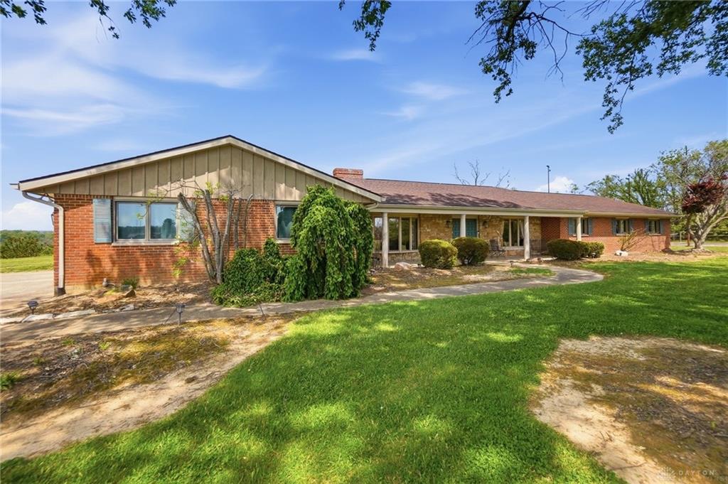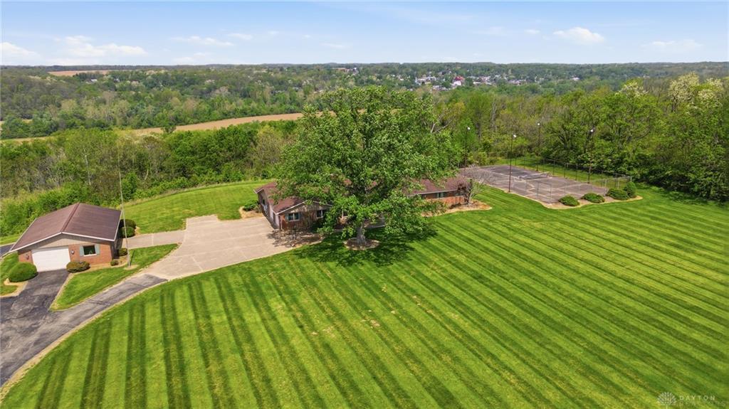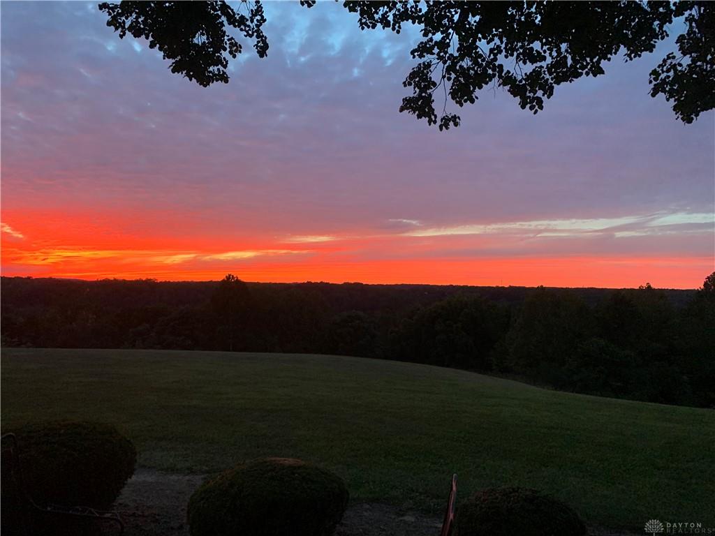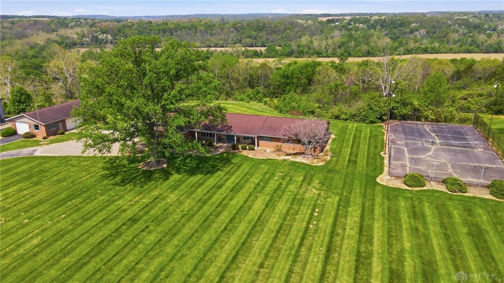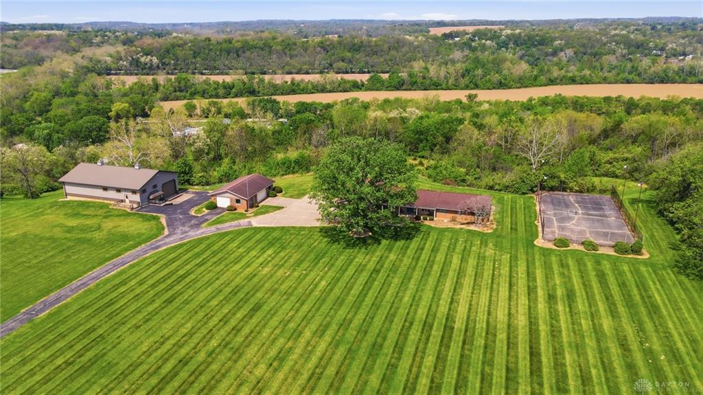 One of a kind property offering truly unbelievable views where you can see over the rolling hillside for miles & miles, delivering breathtaking sunsets from the rear yard & gorgeous sunrises from the front porch. Simply picturesque from all angles. Situated on just under 16 acres across two parcels in Wayne Township - no city tax, this sprawling 3,108 sq ft custom built ranch offers 4 bdrms & 2 full baths w/ an attached 2 car garage w/ pull down attic storage. Solid wood double doors welcome you into the foyer positioned between the formal living & formal dining rooms, leading to the heart of the home, the eat in kitchen, where large windows perfectly frame the stunning landscape while you enjoy meals, work or entertain. The cozy family room w/ fireplace flows into an expansive rec room ideal for entertaining, complete with space for a pool table, gaming area & more, all while continuing to capture the incredible views. Large laundry/mud room w/ exterior access connects to the guest bath, while down the hall you will find three guest bedrooms & a spacious primary suite w/ en suite bath. Updates include newer Pella wood casement windows, updated roof and updated HVAC. The property also features a detached garage/barn approximately 43x28 (1204 sq ft) with two large doors offering space for 4-5 vehicles, equipment or toys. A second detached structure is a massive Morton Barn w/ electric, partial plumbing, multiple air compressor hookups, an indoor basketball court, space for a future pickleball court & a second floor finished office w/ rec room. Park your boat, RV or whatever you need inside. This barn is a dream! A full size outdoor tennis/pickleball court completes this exceptional property offering privacy, versatility & unmatched scenic beauty. This type of property is rare, what an amazing place to call home! Photos do not do it justice. You must tour the property to appreciate its true, rare beauty. Walking distance to the bike path, minutes from Casears Creek.