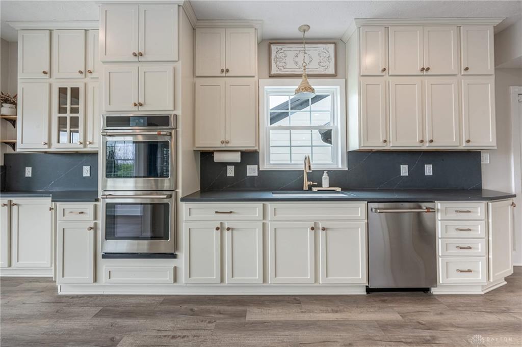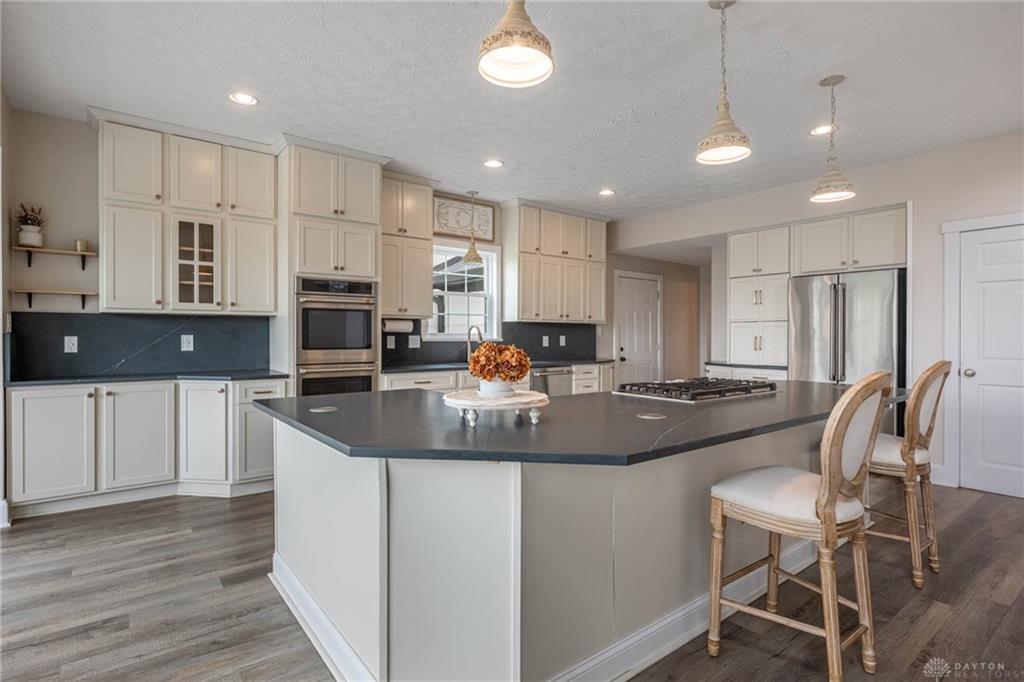 Inside, the home blends modern style with everyday comfort. The fully remodeled kitchen features honed quartz countertops, Café appliances, double wall ovens, and a gas cooktop. The perfect space for both daily living and entertaining. Updated flooring throughout and refreshed bathrooms elevate the entire space, while the double-sided fireplace adds warmth and character.