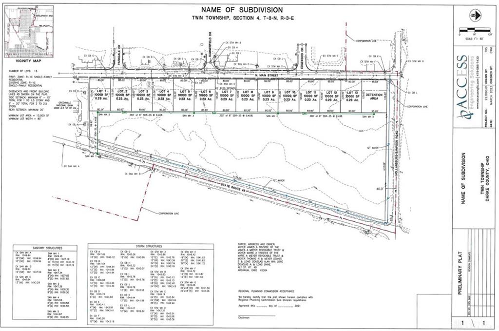 This is a mixed - use parcel consisting of a business-zoned eastern side of 8.4 acers and 13 identical .23 acre residential-zoned plots on the west side. No utility work has been started or completed. However, engineering design and drawings have been completed and are available for review.